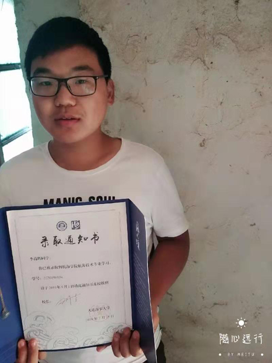 據(jù)了解,李高輝是一個命苦的孩子,很小的時候父親因病去世,母親改嫁,無奈,他只好跟隨年邁多病的爺爺奶奶一起生活,家庭十分拮據(jù)。俗話說,窮人的孩子早當(dāng)家。李高輝從小學(xué)就知道勤奮學(xué)習(xí),養(yǎng)成了不懼困難,愛幫助別人的性格,深受師生喜愛。經(jīng)過10多年努力拼搏,2019年高考,他以優(yōu)異的成績被大連海事大學(xué)航空學(xué)院錄取。
