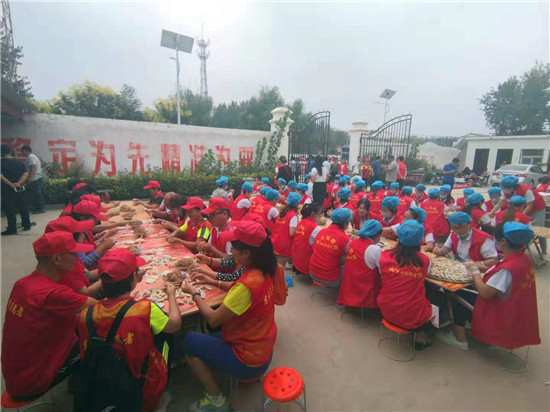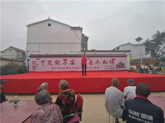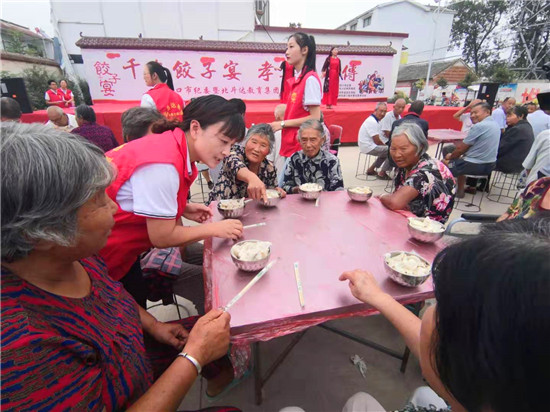 與此同時(shí),在演出現(xiàn)場(chǎng)附近的村委大院內(nèi),由周口市慈孝文化促進(jìn)會(huì)、北斗達(dá)教育集團(tuán)等組成的200多名志愿團(tuán)隊(duì)正忙得不亦樂(lè)乎,調(diào)餡、包餃子、下鍋、端盤(pán),兩個(gè)多小時(shí)內(nèi),他們精心包出20000多個(gè)愛(ài)心水餃。11時(shí)30分,餃子宴正式開(kāi)始,老人們一邊吃著水餃一邊觀看者演出,喜笑顏開(kāi),呈現(xiàn)出一片相親相敬的溫馨畫(huà)面。