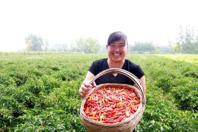 在朱樓行政村,朱高杰、王麗夫妻倆正帶領(lǐng)20多名采摘工人在辣椒田里采摘艷紅、泡椒兩個品種,地頭停放著盛滿辣椒的三輪車和五六個蛇皮袋,火紅的辣椒映襯著小兩口臉上燦爛的笑容:“大豐收呀,這塊地是泡椒,還沒有出地頭,就劃3.8元一斤了,走向市場至少五六元錢。咱吃的泡椒鳳爪、泡椒罐頭,都是這做的。像那塊地的艷紅,就像它的名字一樣又紅又鮮艷,出地頭就得七八塊,賣到市場上都10多元一斤,主要賣到四川、湖北等地,這是火鍋底料、炒菜的必備品,這是個炒出來有香味的辣椒品種。”王麗能說會道,而且在她的帶動下,全鄉(xiāng)許多親朋好友都在種植辣椒。像王麗一樣,汲水鄉(xiāng)種植辣椒面積突破了1萬畝,整個鄲城縣種植辣椒突破5萬畝。