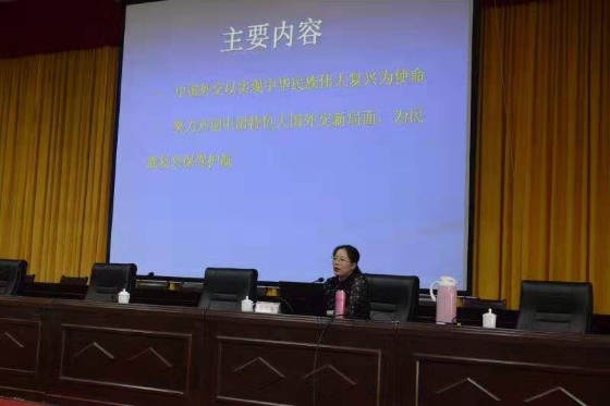 姚巧華從“新時(shí)代中國(guó)外交堅(jiān)持以實(shí)現(xiàn)中華民族偉大復(fù)興為使命”“努力開創(chuàng)中國(guó)特色大國(guó)外交新局面,為民族復(fù)興保駕護(hù)航”兩個(gè)大方面,深刻闡述了“習(xí)近平新時(shí)代中國(guó)特色社會(huì)主義外交思想”。所講觀點(diǎn)鮮明,重點(diǎn)突出,講法靈活,圖文并茂,事例貼切,語言精準(zhǔn),理論性強(qiáng),具有很強(qiáng)的指導(dǎo)性。