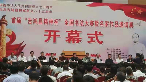 為紀念抗日民族英雄吉鴻昌將軍就義85周年,大力弘揚愛國主義精神和中華民族優(yōu)秀傳統(tǒng)文化,9月28日上午,首屆“吉鴻昌精神杯”全國書法大賽暨名家作品邀請展在扶溝縣體育館隆重舉行。原廣州軍區(qū)政治部副主任陳大民少將、解放軍報社原副社長田仁德少將、解放軍報社原副總編孫臨平少將、解放軍裝備學院原副政委孫南京少將、解放軍總后勤部某研究所原所長楊廷欣少將、吉鴻昌將軍親屬鄭吉安大校,市委常委、周口軍分區(qū)政委孫先振,市政協(xié)副主席張文平,扶溝縣四個班子領(lǐng)導及副處級干部等出席開幕式??h委副書記、政法委書記詹凱主持儀式。