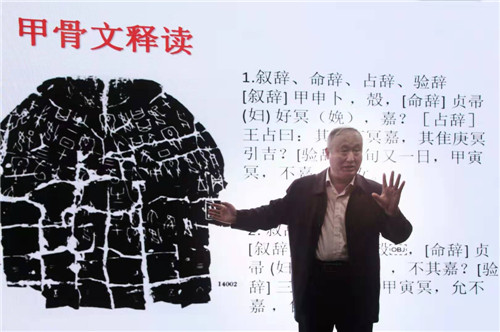 接著,在歷時(shí)兩個(gè)半小時(shí)的分享中,郝教授以融合發(fā)現(xiàn)、甲骨文字拆分、甲骨文書風(fēng)及甲骨文書法創(chuàng)作為立足點(diǎn),襯以個(gè)人習(xí)書作品,從文化本義的內(nèi)涵、文化本義的要素、文化的生成和甲骨文的演化和發(fā)展等方面詳細(xì)闡述了文化的來(lái)源以及人類社會(huì)進(jìn)步的過程。