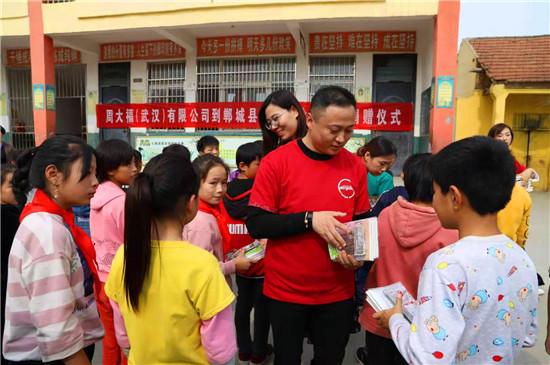 10月24日,周大福河南區(qū)域負(fù)責(zé)人岳磊一行15人,帶著書(shū)包、文具、足球、藍(lán)球等學(xué)習(xí)用品,來(lái)到鄲城縣丁村鄉(xiāng)徐莊小學(xué),為200余名學(xué)生送來(lái)了愛(ài)心大禮包。并為兩戶(hù)貧困戶(hù)送去了米面油等慰問(wèn)品。
