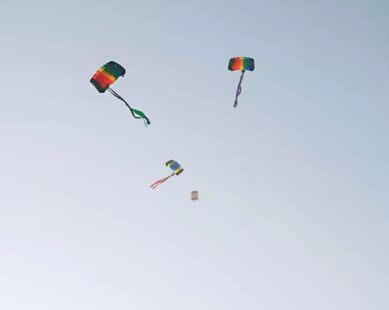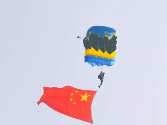 “看,跳傘表演開始了?!?0月29日上午,周口西華通用機(jī)場首航儀式結(jié)束后,一場精彩絕倫的飛行表演就開始了。載著跳傘運動員的飛機(jī)起飛到指定地點后,運動員攜帶著國旗和彩帶從高空中跳下,打開傘包后,空中五顏六色十分漂亮,引得圍觀群眾不時叫好。