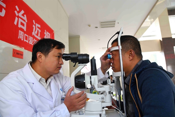 11月8日是記者節(jié)。為了讓奔波在新聞戰(zhàn)線,熬夜趕稿、組版的編輯記者眼睛更健康,11月5日,周口愛爾眼科醫(yī)院的醫(yī)生將儀器搬到周口報業(yè)傳媒集團,現場為編輯記者檢查眼睛,關愛新聞工作者的身心健康。圖為眼科醫(yī)生為記者檢查視力、實施治療。記者 劉俊濤 梁照曾 攝