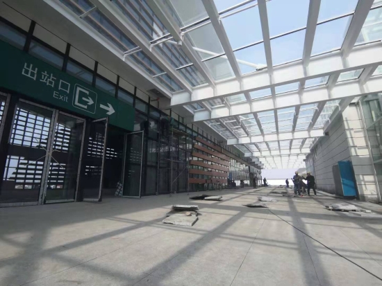 經(jīng)過(guò)檢票機(jī)安檢通道,乘電梯或步梯通往站臺(tái)。該站站場(chǎng)設(shè)2臺(tái)4條(含正線2條),設(shè)基本站臺(tái)、側(cè)式站臺(tái)各1座,站臺(tái)最高聚集人數(shù)為600人。