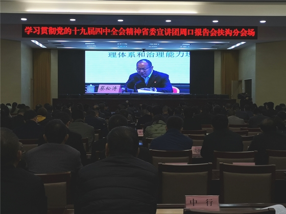 根據(jù)省委統(tǒng)一部署,11月27日,學(xué)習(xí)貫徹黨的十九屆四中全會精神省委宣講團(tuán)報告會在周口市舉行,扶溝縣四個班子領(lǐng)導(dǎo)和縣直各單位負(fù)責(zé)人在扶溝分會場聆聽宣講報告。