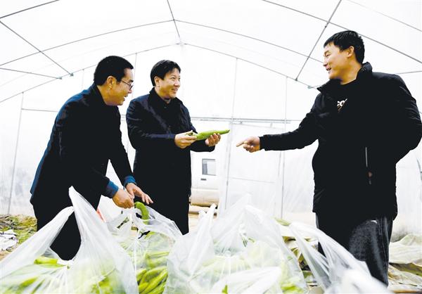 近日,周口報業(yè)傳媒集團幫扶村——淮陽縣馮塘鄉(xiāng)劉莊村的扶貧蔬菜大棚最后一棚辣椒采摘上市。據(jù)了解,這里產(chǎn)的辣椒個頭大、口感好,很暢銷。圖為周口報業(yè)傳媒集團黨委副書記、總編輯、周口日報社總編輯顧玉杰(中)向種植戶了解辣椒銷售情況。 記者 梁照曾 攝