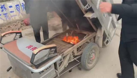 “當(dāng)時(shí)在我們前方的一輛電動(dòng)三輪車駕駛座下冒出黑煙,車上兩位老人察覺到危險(xiǎn)后,急忙下車,站在一旁不知所措。我們也緊跟上前。事發(fā)突然,現(xiàn)場(chǎng)沒有滅火器和可利用水源,而三輪車的火越來(lái)越大,兩位老人著急萬(wàn)分,在旁邊不停地請(qǐng)求我們幫幫她們。根據(jù)經(jīng)驗(yàn),我們當(dāng)機(jī)立斷利用路邊的泥土進(jìn)行撲救,經(jīng)過(guò)幾十秒的緊張撲救,著火部位被成功撲滅?!比幌狸?duì)員回憶說(shuō)三輪車是電線短路引起的電瓶著火。