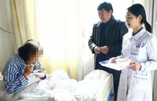 餃子煮好,盛入碗內,端入病房,親手送到患者手中,看到患者品嘗餃子時的開心樣子,醫(yī)護人員從心里笑到了臉上。