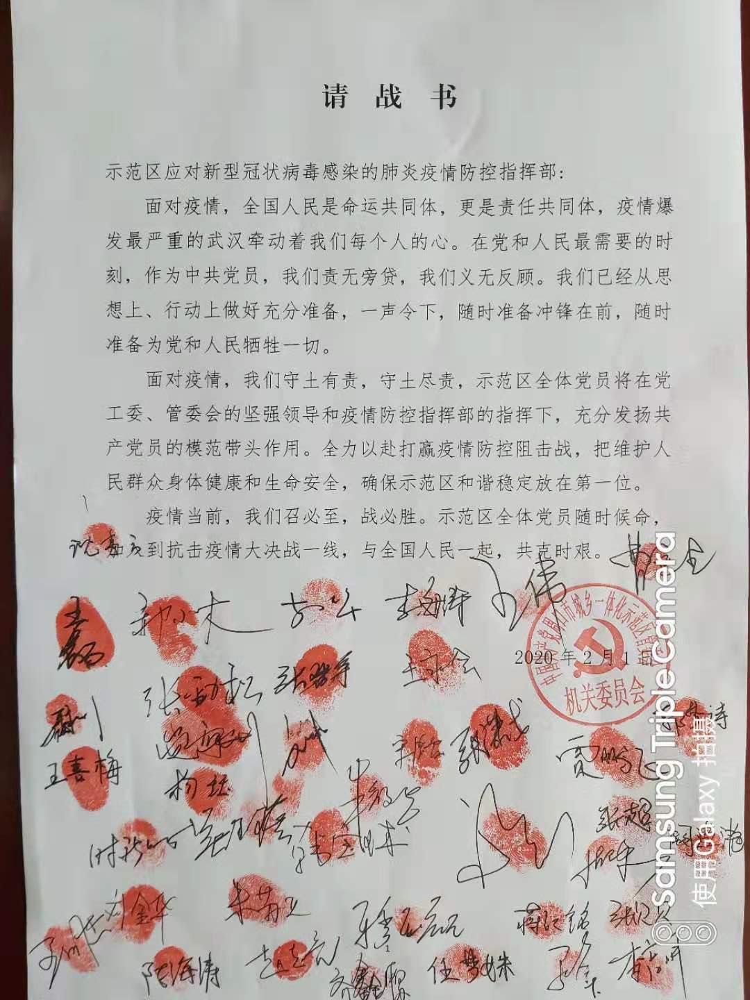 為了能到戰(zhàn)“疫”一線,示范區(qū)廣大黨員干部紛紛簽下“請戰(zhàn)書”,自愿要求加入到抗擊新型冠狀病毒感染的肺炎疫情戰(zhàn)斗中去。“請戰(zhàn)書”上,他們紛紛按下鮮紅的指印,在指印下面,是每個黨員堅定的簽名,從這些指印和簽名可以看出每個黨員堅定的黨性和為了抗擊疫情大無畏的英雄氣概。