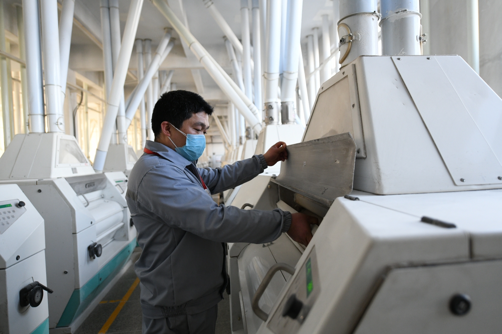 昨日,在五得利集團(tuán)周口面粉有限公司的生產(chǎn)車間內(nèi),記者看到,工人們戴著口罩緊張有序地忙碌著。該企業(yè)于2月2日全面復(fù)工,目前日處理小麥3000噸、生產(chǎn)面粉2300噸。