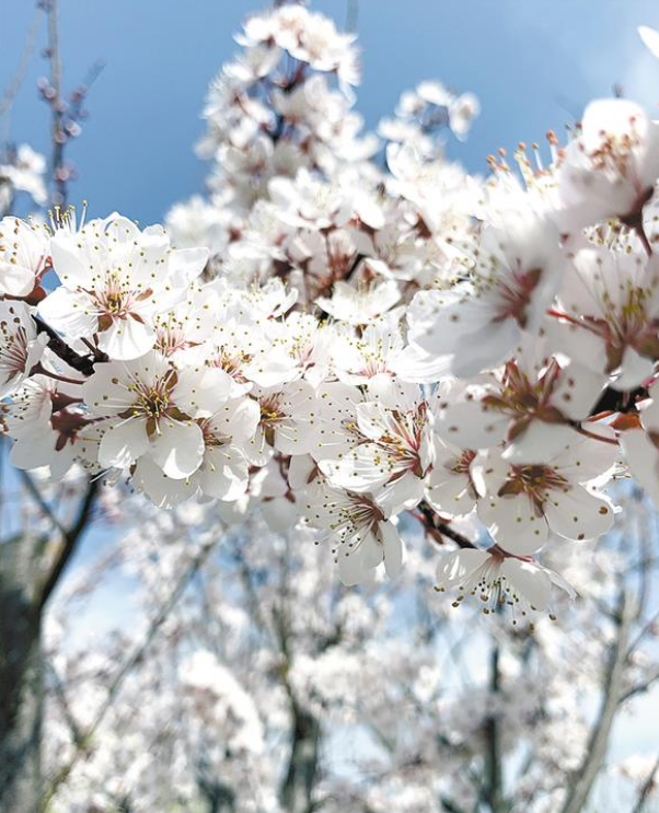 “一葉春風(fēng)吹動蕾,紅葉李花妍漫天?!奔t葉李又名紫葉李,屬薔薇科。走近觀看,細細密密的粉白色繁花開滿枝頭,在紫色葉子的襯托下,顯得別致、靚麗。遠遠望去,像是爛漫層疊的櫻花,又宛如飄落大地的云霞,為春天平添幾分嫵媚、幾分浪漫。