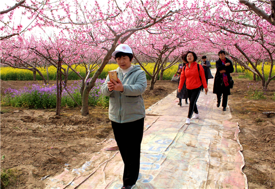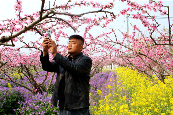 “老鐵們,今年桃花節(jié),因受疫情影響,是網上舉辦的,喜歡看黃橋桃花的網友,不要遺憾,我是您的忠實老鐵,每天會準時給您分享桃花節(jié)的美景圖片及視頻,讓您足不出戶觀賞到萬畝桃園桃花盛開的美景。”3月22日,在西華縣潁河灣生態(tài)采摘園,網紅“西華桃子哥”和合盛正在拍攝桃園美景,一邊通過抖音、快手、微信群向網友拍攝上傳桃花盛開的視頻、圖片等美景,一邊樂此不疲地口中念念有詞道。