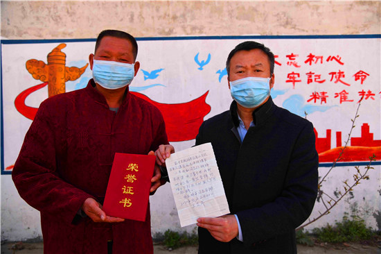 “疫情風(fēng)聲鶴唳,村里還有10家從武漢回村過年的村民,大年初一,上面要求封村了,鄉(xiāng)親們還是亂跑,到河邊扎堆釣魚,攆不散”,王志成說,他心急如焚,深知疫情嚴(yán)重,在這種情況下,一家人感染,一個(gè)村子的人咋辦?,一定得有人管。他在街上碰見十一組村民、退伍兵王明甫,兩人想法相合,隨即決定,成為自愿抗疫小分隊(duì),自己籌備物質(zhì),開展動(dòng)員村民居家抗疫、幫助困難村民、對(duì)村里實(shí)施消毒等抗疫事宜。王明甫向縣農(nóng)發(fā)行駐村第一書記王長(zhǎng)海匯報(bào)后,得到大力支持。