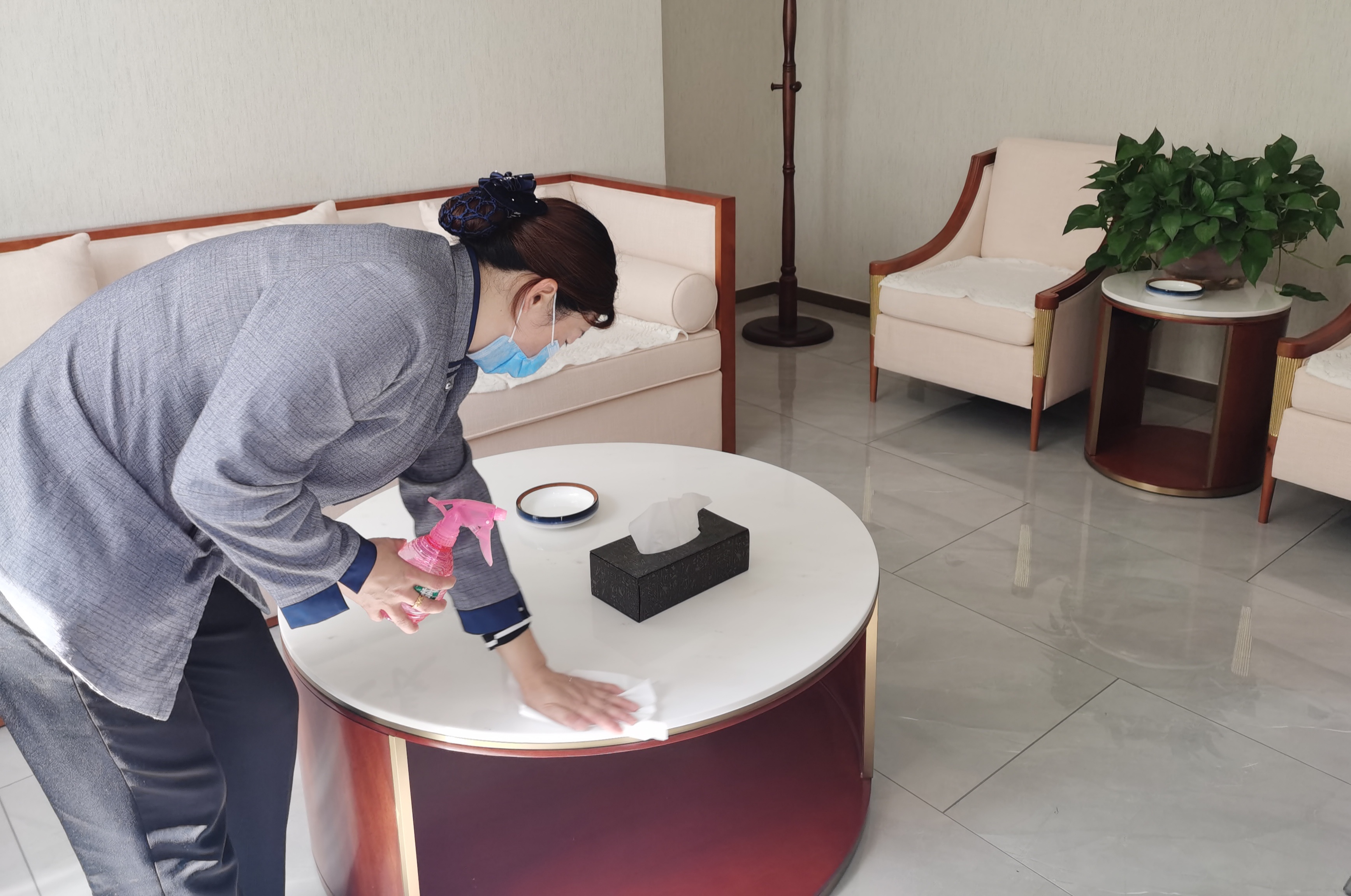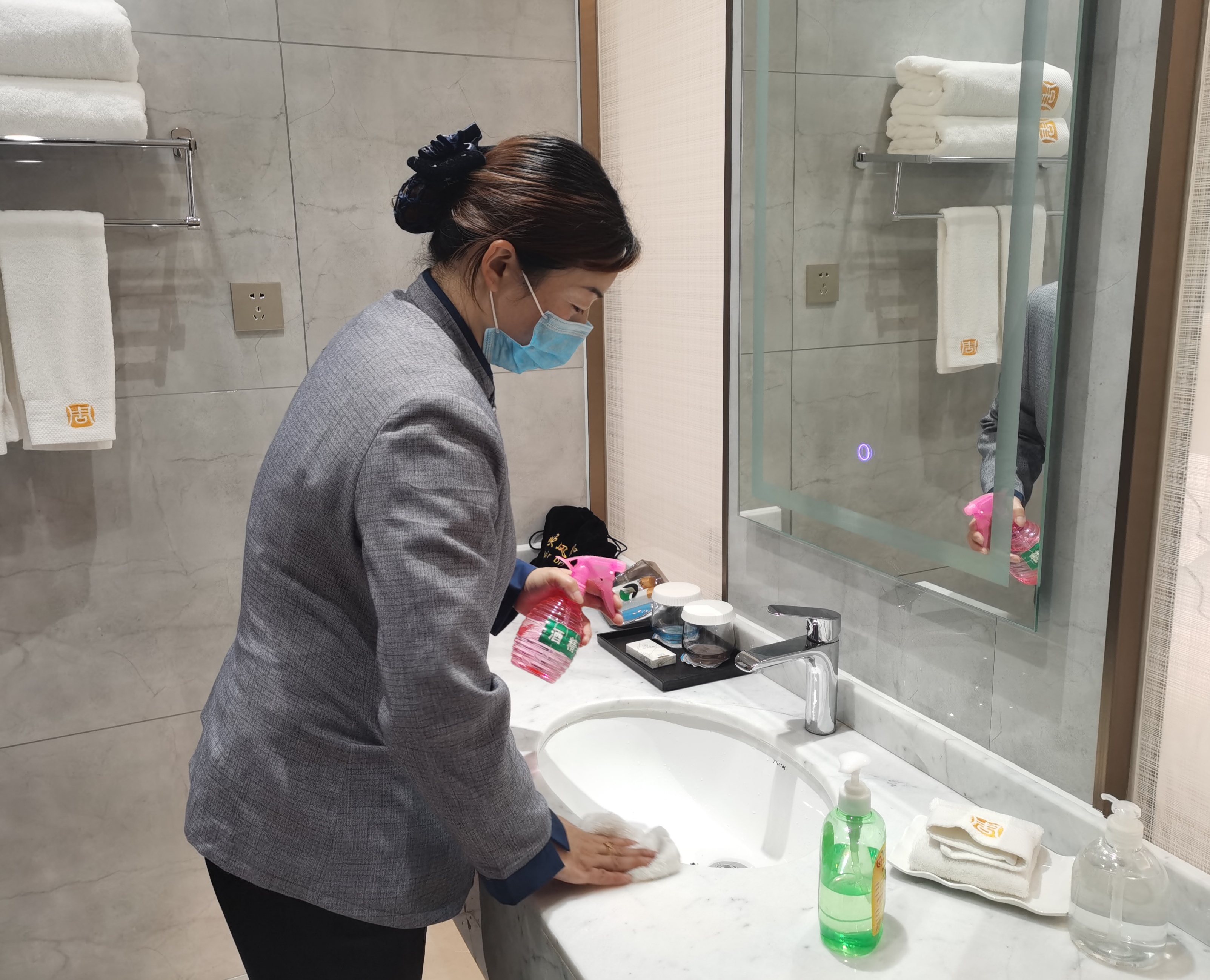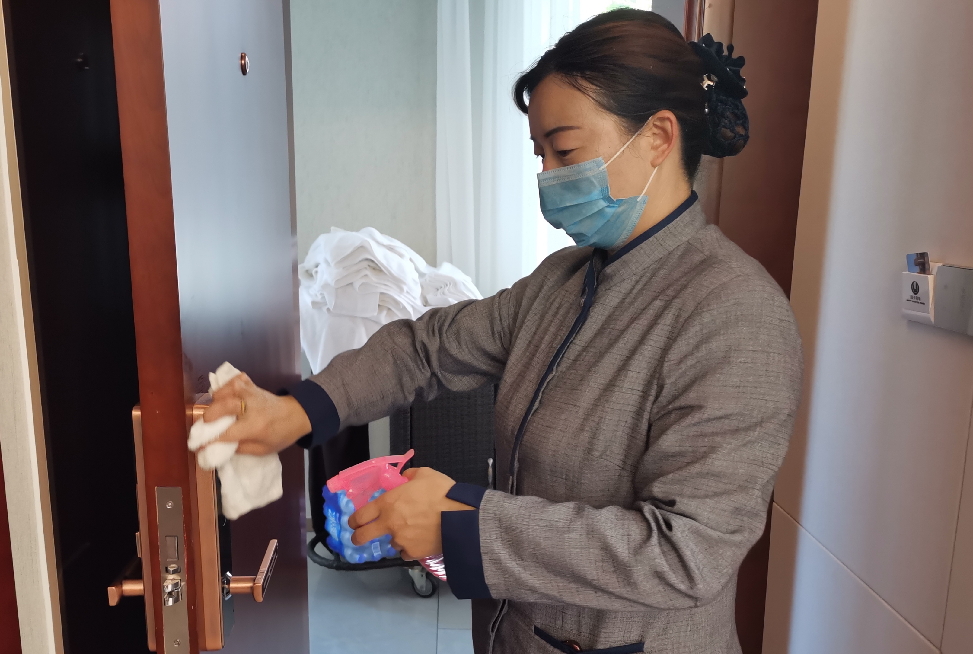5月10日,記者在“兩會”駐地酒店看到,酒店工作人員不時(shí)對客房和公共場所、會議室進(jìn)行消毒、擦拭。受疫情影響,“兩會”駐地酒店工作人員認(rèn)真和精心準(zhǔn)備,加強(qiáng)了對代表、委員駐地消殺防疫,還貼心地放置了一次性電梯按鍵專用紙、酒精等物品。