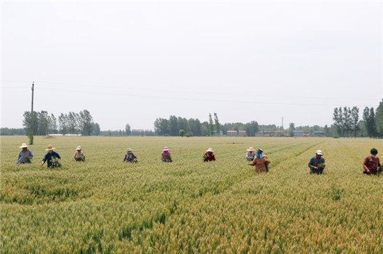 5月16日,記者在鹿邑縣棗集農(nóng)場看到,2800多畝的良種小麥繁育基地里50多人分成四支隊(duì)伍一字排開,在綠波碧浪的小麥田里認(rèn)真排查、進(jìn)行提質(zhì)去雜工作。
