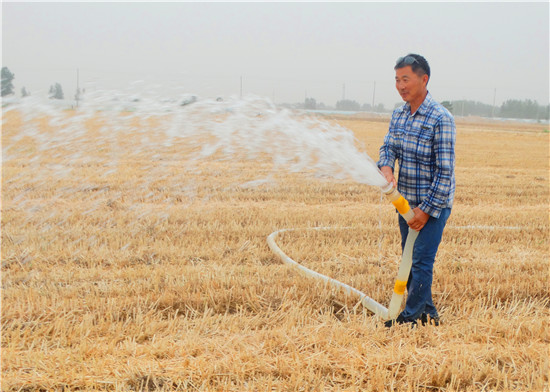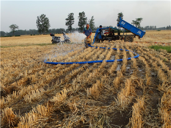 6月6日,沈丘縣周營鎮(zhèn)農(nóng)民正忙著抗旱“造墑”、“補墑”澆水,期待奪取秋糧豐收。 近期來,由于連續(xù)多日高溫?zé)o雨,土壤墑情差,無法播種秋作物。針對當下嚴重的旱情,沈丘縣掀起“雙抗旱”(抗旱保苗、抗旱種秋)高潮。目前,該縣日出動勞力1.8萬余人,出動各類噴灌機械26000多臺(套),力保農(nóng)田播種的玉米出苗。