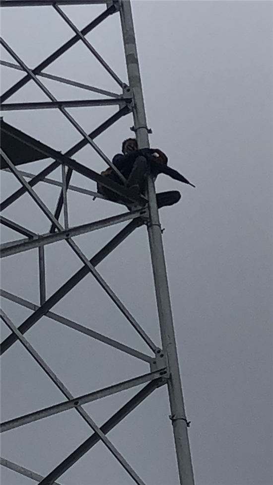 6月18日上午8時(shí)19分,付井鎮(zhèn)派出所值班民警趙良,韓高峰接到報(bào)警電話,一名山東省滕州籍男子因?yàn)楦星槊茉谳爡^(qū)高鐵附近一信號塔上準(zhǔn)備自殺。值班民警向所長陳劍鵬匯報(bào)后,陳劍鵬立即帶領(lǐng)民警霍玉亮、韓高峰以及輔警楊國強(qiáng)、孫海紅、王初中、范紅偉等人迅速趕到現(xiàn)場。