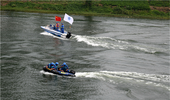 上午9時,隨著田林“開始演練”命令的下達(dá),60人組成的搶險突擊隊(duì),緊張有序開展了五個科目的演練。突擊隊(duì)員通過巡堤查險,觀察堤坡及堤腳附近有無滲水、管涌、裂縫、滑坡、漏洞等險情。發(fā)現(xiàn)險情后,迅速采取導(dǎo)滲、截滲等搶險措施,確保險情得到及時、正確、有效的處理或控制。發(fā)現(xiàn)落水人員,四艘沖鋒舟分工明確,立即前往落水地點(diǎn)進(jìn)行救助。
