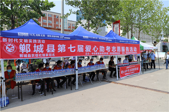 7月7日清晨,鄲城縣的志愿者們在考點(diǎn)外搭建“愛心助考志愿服務(wù)”站點(diǎn)。為考生免費(fèi)提供瓶裝水、防暑應(yīng)急藥品等用品,為等在考場外的家長們提供臨時休息場所、飲用水等服務(wù),在炎熱的夏日里為他們送上一份清涼和安心,為高考學(xué)子助考加油。同時,志愿者維持考點(diǎn)周邊市容環(huán)境的整潔有序,對于大聲喧嘩等不文明行為及時勸阻;協(xié)助交警疏導(dǎo)交通,減少道路噪音對考試的影響,確保道路交通安全有序。