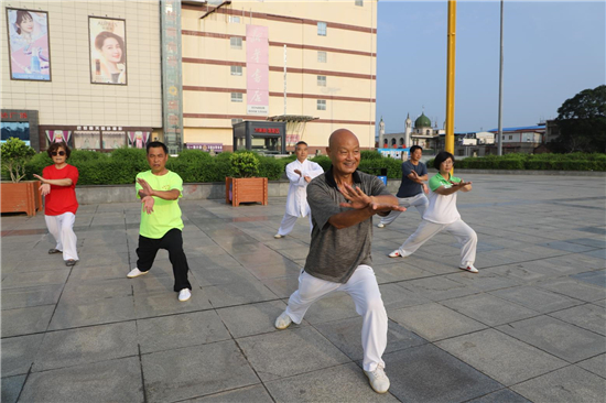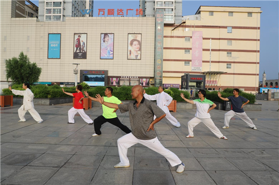 冬練三九,夏練三伏,練出一身真功夫。投伏第一天,周口市武術協(xié)會會長張志民帶領會員在五一文化廣場習練新編和氏26式太極拳。記者 王凱 攝