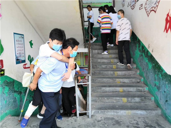 “終于到了,要不是身體好,還真不能一口氣把這孩子背上三樓。”鄲城縣第三實(shí)驗(yàn)中學(xué)考務(wù)老師張子江邊擦汗邊笑著說。