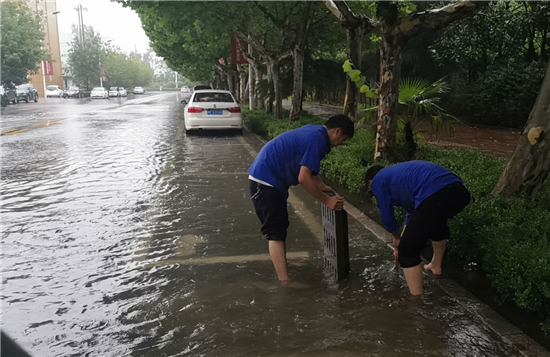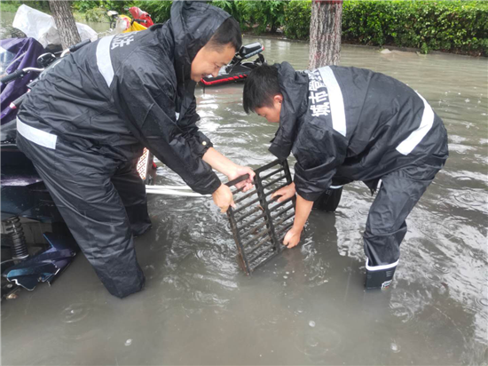 從7月21日傍晚起,商水縣普降暴雨,縣城區(qū)內(nèi)多處道路被淹,為保障群眾出行安全,縣城管局迅速啟動防汛排澇緊急預(yù)案,多措并舉,全力開展防汛排澇工作。圖為7月22日,商水縣城管局應(yīng)急人員在商慶路北段徒手對道路雨水管網(wǎng)排水口進行疏通。