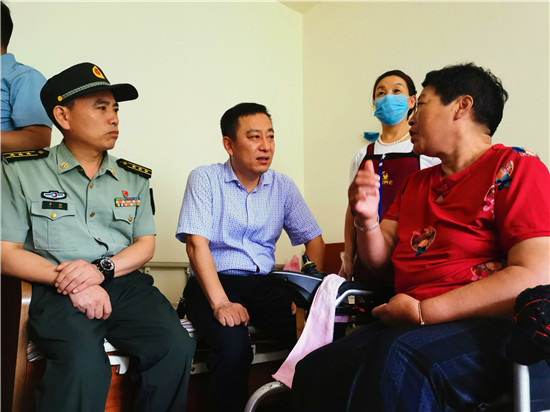 走進(jìn)位于太昊路上的周口市老年護(hù)理院,院內(nèi)整潔有序、花蕊吐香鳥鳴聲聲,小徑通幽處的涼亭內(nèi)三五老人打牌、聊天,一副愜意安詳?shù)纳顖?chǎng)景。在侯國(guó)領(lǐng)母親王玉勤居住的房間內(nèi),李揚(yáng)、孫光濤等人坐在床邊與她聊天談心,看到這么多人來慰問她,王玉勤眼中流下了感動(dòng)的眼淚,她對(duì)慰問人員表示感謝,說自己來護(hù)理院近一年來,吃住條件都不錯(cuò),護(hù)理院照顧的無微不至,身體一天天恢復(fù),閑暇時(shí)還能不依賴輪椅自己走上一段路。她激動(dòng)地說:“感謝黨和政府的親切關(guān)懷,我最大的愿望是希望倆兒子永遠(yuǎn)聽黨的話,在部隊(duì)安心服役、再立新功,用優(yōu)異的成績(jī)回報(bào)黨和政府對(duì)我們?nèi)业年P(guān)愛?!?/p>
