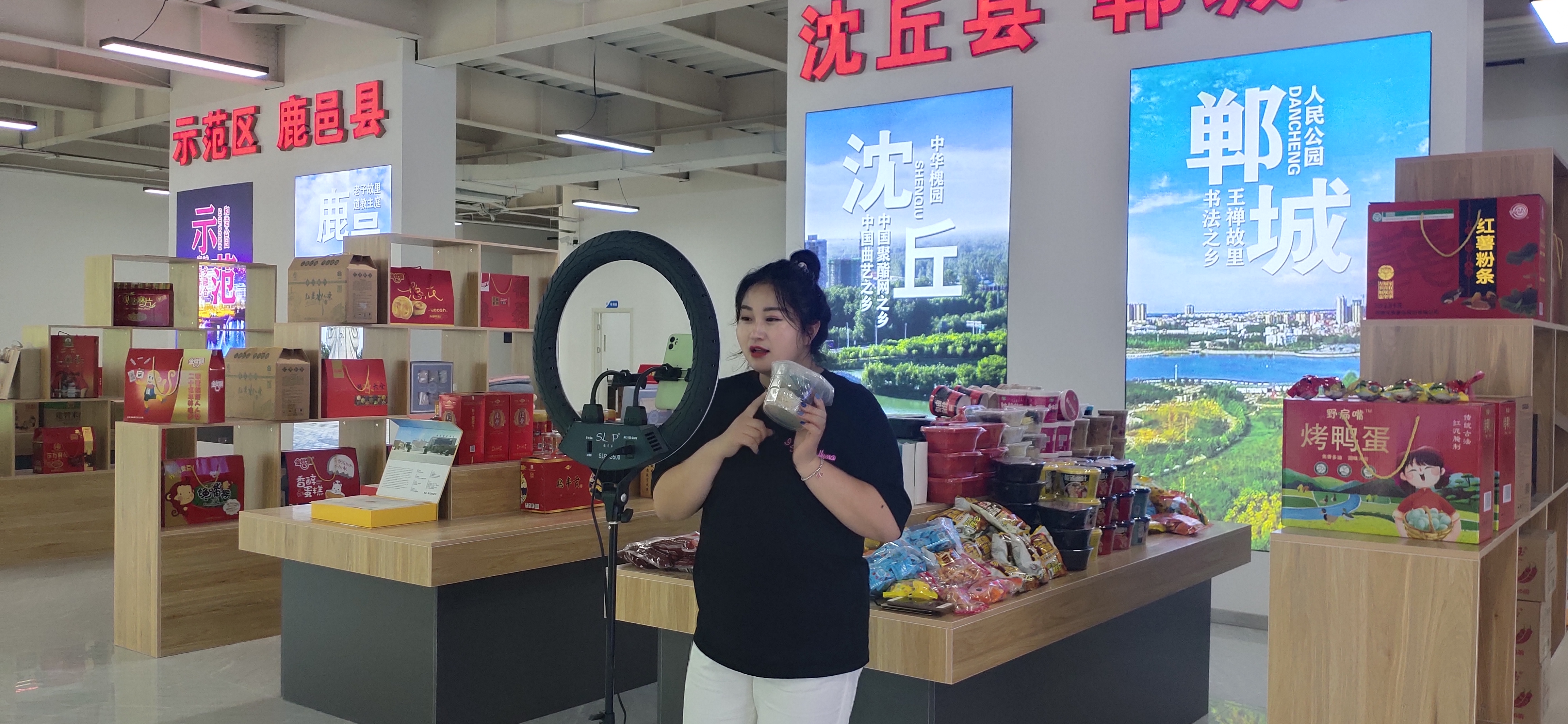 中心展廳面積達(dá)1000多平方米,按照不同縣(市、區(qū))劃分為十幾個區(qū)域,集中展示邦杰牛肉、伏羲貢酒、鄧城豬蹄、汝陽劉毛筆、三川豫龍復(fù)合肥等周口產(chǎn)品。這些產(chǎn)品都是來自各縣(市、區(qū))等地農(nóng)工副土特產(chǎn)品以及非遺產(chǎn)品?!拔覀儗⑼ㄟ^抖音、快手等視頻平臺,把這些產(chǎn)品銷往全國各地?!?該基地負(fù)責(zé)人、周口東方會展商會會長于海崗說。