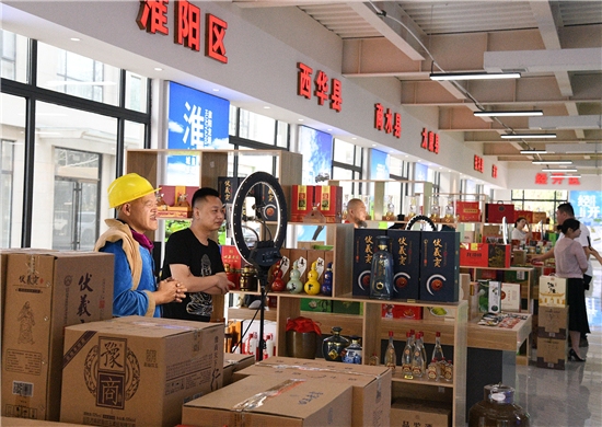 記者看到,川匯區(qū)直播電商產(chǎn)業(yè)基地直播大廳內(nèi),全市各個縣市區(qū)都在此設(shè)有土特產(chǎn)直播區(qū),川匯區(qū)賣的有伏羲貢酒等,淮陽區(qū)賣的泥泥狗、布老虎、黃花菜、健身器具等,西華縣賣的有胡辣湯料等各種土特產(chǎn)。商家們“八仙過海,各顯神通”紛紛請來各路網(wǎng)紅大咖們助力直播。川匯區(qū)四五酒業(yè)請來“光頭強(qiáng)”熱賣四五老酒,西華縣的商家請來“趙本山”帶貨直播叫賣。