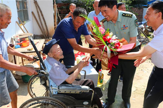 于永前一行來到楊廟鄉(xiāng)大祁行政村時已近中午,正趕上97歲抗日老戰(zhàn)士吳之太過生日。吳之太老少一家人歡聚一堂,其樂融融。看到慰問組的到來,老人喜極而泣。吳之太老人擦著眼淚說:這些年沒少給黨和政府找麻煩,尤其是縣退役軍人事務(wù)局成立后,幫助他解決了好多困難和問題,并定期來看望他,今天又見到大家,真不知道該說什么好。潘布道代表退役軍人事務(wù)局向老人祝賀生日并告訴老人說:抗戰(zhàn)老戰(zhàn)士是民族的英雄、國家的財富,為黨的革命和建設(shè)作出了不可磨滅的貢獻(xiàn)。今后,將一如既往地關(guān)心和幫助抗戰(zhàn)老戰(zhàn)士,盡力幫助解決生活中的實際問題,在全社會形成尊重抗戰(zhàn)老戰(zhàn)士、尊崇抗戰(zhàn)老戰(zhàn)士、關(guān)愛抗戰(zhàn)老戰(zhàn)士的良好氛圍。