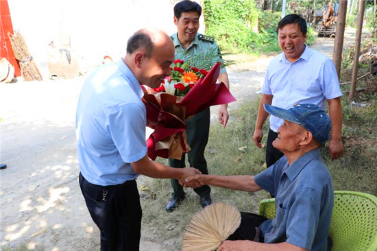 今年,是中國人民抗日戰(zhàn)爭暨世界反法西斯戰(zhàn)爭勝利75周年。太康縣委常委、縣人武部部長于永前,縣退役軍人事務(wù)局黨組書記、局長潘布道日前先后來到高賢、楊廟等鄉(xiāng)鎮(zhèn)走訪慰問抗日老戰(zhàn)士,開展“敬獻(xiàn)一束鮮花、表達(dá)一聲問候、送上一份禮品、備一個健康包、拍一張合影留念照片”“五個一”活動,把黨和政府的關(guān)懷溫暖送到老戰(zhàn)士的心坎上。