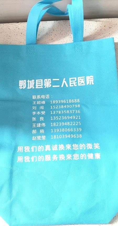 昨天上午,郭女士因?yàn)榧卓簛?lái)門(mén)診求醫(yī)。王超峰診斷后遞給她一個(gè)手提袋。郭女士發(fā)現(xiàn),手提袋上印有科室醫(yī)生職稱(chēng)、專(zhuān)業(yè)特長(zhǎng)、門(mén)診時(shí)間、聯(lián)系電話等,還可以裝化驗(yàn)單、病例及其他雜物,不由高興地說(shuō):“這個(gè)手提袋又實(shí)用又方便,袋上的字號(hào)大,老花眼也能看得清,打電話找醫(yī)生不用再麻煩別人了。真是太好了!”