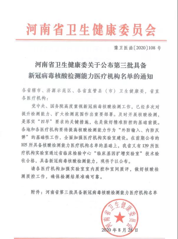 近日,鄲城縣婦幼保健院PCR核酸檢測實驗室通過了河南省臨床檢驗中心的室間質量評價和實驗室二級生物安全備案,已具備新冠病毒核酸檢測能力,可承擔新冠病毒核酸檢測工作。目前,各高校正在陸續(xù)開學,但新冠疫情仍未完全控制,按照疫情防控要求,報到學生需進行一次核酸檢測,持報告單入學報到。鄲城縣婦幼保健院作為河南省衛(wèi)生健康委員會批準的新冠核酸檢測機構,積極承擔社會責任,按照“應檢盡檢,愿檢盡檢”的原則,已經(jīng)于2020年9月1日起正式開展新冠病毒核酸檢測工作,希望廣大學子及有檢測需要的人員,本著對自己負責、對家庭負責、對社會負責的原則,積極檢測,為疫情防控工作貢獻力量。
