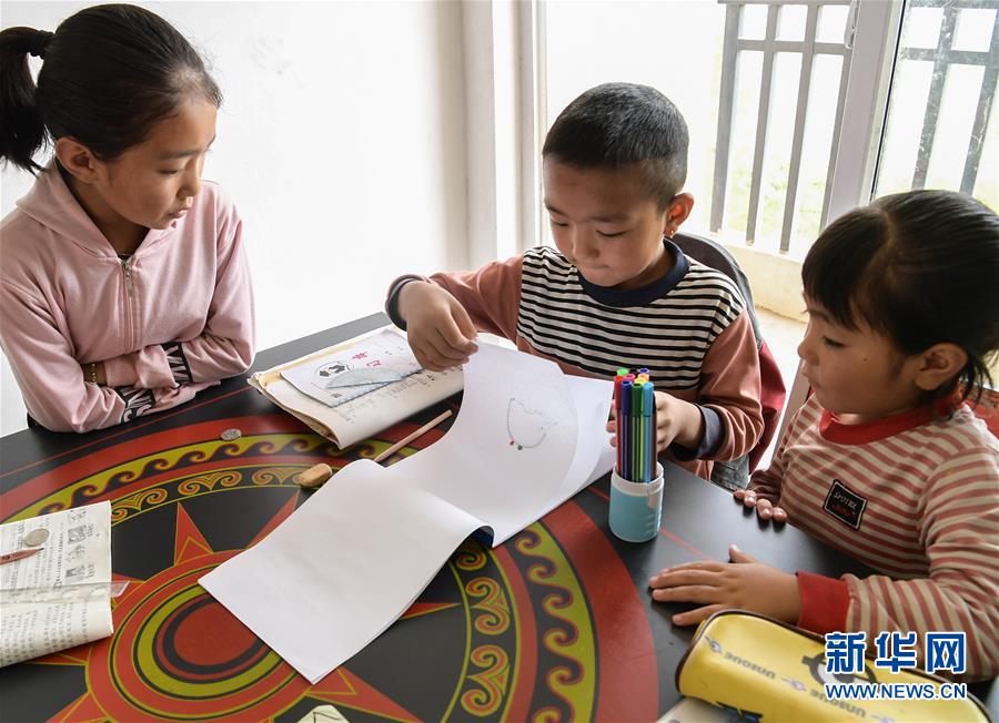 昭覺縣城城郊集中安置點(diǎn)南坪社區(qū)內(nèi),一戶彝族群眾家中的孩子圍坐在書桌旁畫畫(8月11日攝)。 新華社記者 李賀 攝