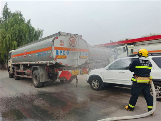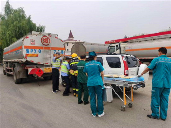 當(dāng)日上午10時(shí),商水交警大隊(duì)指揮中心接到報(bào)警:在商水縣興商大道與陳勝大道交叉口西、湯莊油庫(kù)處,一輛轎車與一輛危化品罐車追尾相撞,正常罐體損壞,?;沸孤镀鸹?,轎車駕駛室變形,駕駛?cè)吮焕к噧?nèi),如不及時(shí)救援,駕駛?cè)擞猩kU(xiǎn),另外因事故現(xiàn)場(chǎng)臨近湯莊油庫(kù),如不及時(shí)處置可能發(fā)生爆炸,后果不堪設(shè)想。
