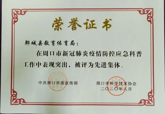 近日,市委宣傳部、市科協(xié)聯(lián)合表彰周口市新冠肺炎疫情防控應急科普工作先進集體和先進個人,鄲城縣教體局被表彰為先進單位,縣教體局副局長劉廣鋒被表彰為先進個人,為全縣教育系統(tǒng)疫情防控工作再添光彩。