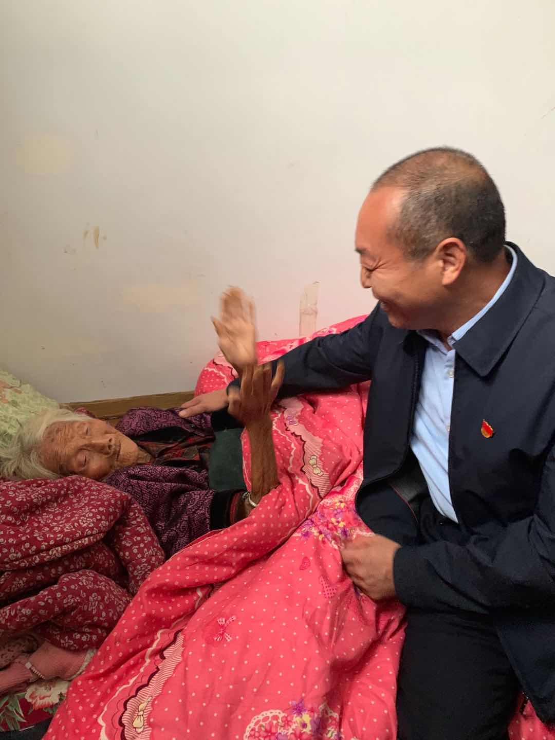 這天,方凱一行帶著嶄新的棉衣、大米、食用油等禮品,首先來到磨臺村看望107歲的老人胡有蘭。躺在床上的老人雖年逾百歲,一眼看見方凱,就認出來了,激動地說:“孩子,你又來了?”說著,就急忙拉住方凱的手,緊緊地握著。看老人不方便坐起來,方凱便坐在老人身邊,笑著說:“是的。娘,兒子來看您啦!”
