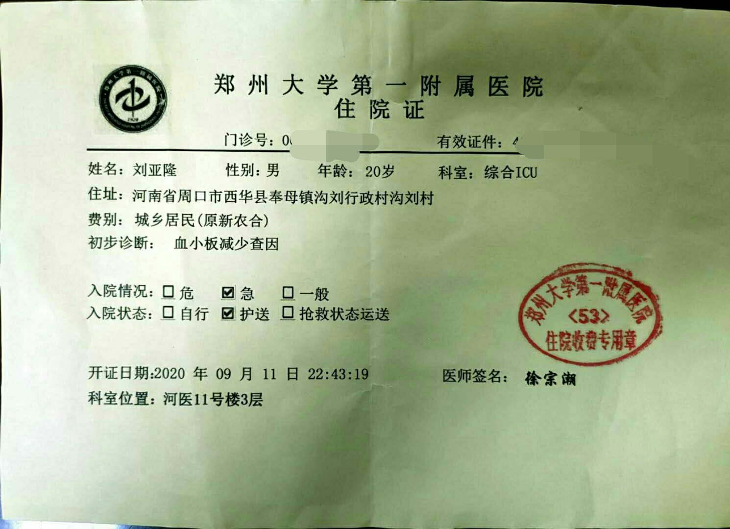 “俺家亞隆今年才20歲,在鄲城一高復(fù)讀一年考了653分,考上‘雙一流’。本來(lái)開開心心的,到9月份要開學(xué)了發(fā)現(xiàn)他身上有出血點(diǎn),牙齦還紅腫,就帶他去漯河檢查。開始說(shuō)是肝上的毛病,查肝的時(shí)候發(fā)現(xiàn)血小板特別低,趕緊轉(zhuǎn)到鄭州,9月15號(hào)確診為白血病。還有四天就要上大學(xué)了,現(xiàn)在只能申請(qǐng)推遲一年入學(xué)?!皝喡寢尭嬖V記者。