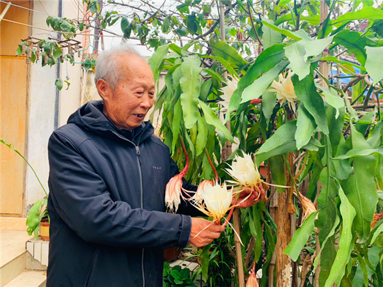 在周口市中心城區(qū)的一個家屬院里,記者見到了88歲的苗天才和他養(yǎng)的曇花,“一株21年樹齡的曇花開了43朵,另外兩株5年樹齡的曇花加起來開了13朵,這3株曇花一共開了56朵。”苗天才說,早上四五點的時候曇花就慢慢地開放了,到現(xiàn)在五六個小時過去了曇花還保持著開放狀態(tài)。