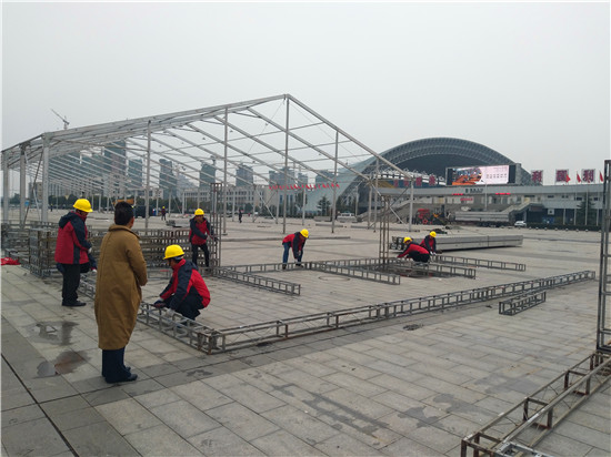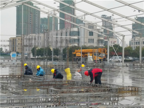 為迎接11月28日至30日舉辦的周商產(chǎn)品展示展覽活動(dòng),現(xiàn)場70余名施工人員不顧天氣惡劣,抓緊搶干工期,爭取在11月25日全面搭建完畢。
