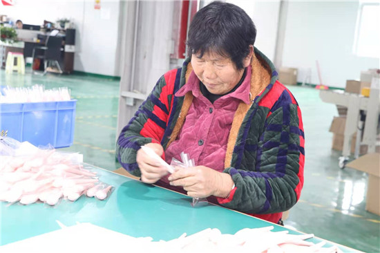 河南雅彩美妝用具有限公司負(fù)責(zé)人趙廣才介紹,公司主要從事化妝刷、美妝用具加工,十分適宜留守婦女干。車間里的工人基本都是貧困戶和住在附近的留守婦女。在家門口上班,既能掙錢,又方便照顧家人。每天中午公司還提供午餐,工人早上來上班,下午下班不耽誤回家照看孩子?!拔疑习嘁呀?jīng)10多天了,再過不久,就可以領(lǐng)工資了,真是高興!”68歲的村民張美榮告訴記者,家里孩子們都大了,自己在家閑著也沒啥事,她就到包裝車間上班,一個(gè)月算下來能掙2000多元,活也不重,既鍛煉了身體,又提高了家庭收入。