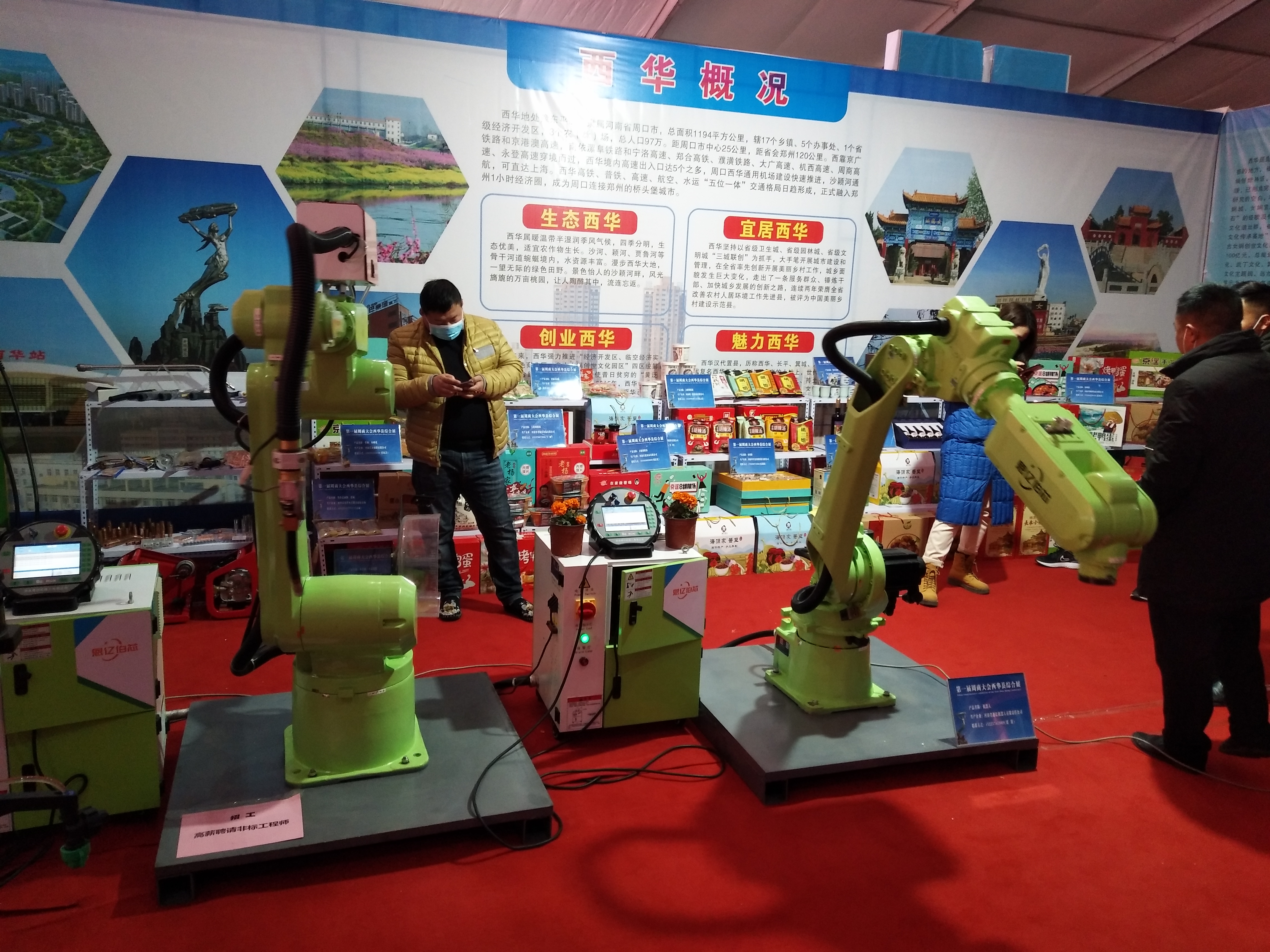在西華縣展位,兩個(gè)高約1.5米、通體綠色的機(jī)械手臂,向來(lái)參觀的市民揮舞著“手掌”。這兩個(gè)機(jī)械手臂來(lái)自河南省恩億伯芯機(jī)器人有限公司,系西華縣本土企業(yè)自主研發(fā)。據(jù)董事長(zhǎng)劉濤介紹,展示的機(jī)械手臂里,帶防撞器的是焊接汽車等大型機(jī)械用的,另一個(gè)是碼垛搬運(yùn)用的,一次能搬運(yùn)20公斤重的貨物。該廠成立于2014年,與宇通、東風(fēng)日產(chǎn)等大型廠商有深度合作,所研發(fā)的工業(yè)機(jī)器人在大理和天津等地均有運(yùn)用。圍觀市民表示,若不是此次周商產(chǎn)品展示展覽會(huì),還真不知道周口有這些高科技企業(yè),希望周商的科技力量讓更多人看到。②8