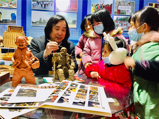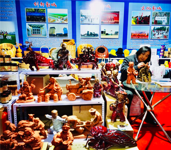 鄲城縣泥塑藝術(shù)大師張振福應(yīng)邀攜48件作品參加大會(huì),成為展會(huì)的一大亮點(diǎn)。其中原生態(tài)泥塑作品18件,有《磨豆汁》《耕耘》《酒逢知己》《二胡曲》等,鈞瓷泥塑作品20件,有《大金蟬》《年年有余》《豫東娃》《瑞牛迎春》等。張振福的作品表現(xiàn)豫東的鄉(xiāng)村人物,作品突出個(gè)性,憨態(tài)可掬,深受觀(guān)眾的喜愛(ài),大家紛紛駐足觀(guān)看。