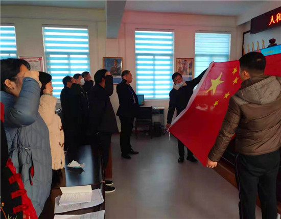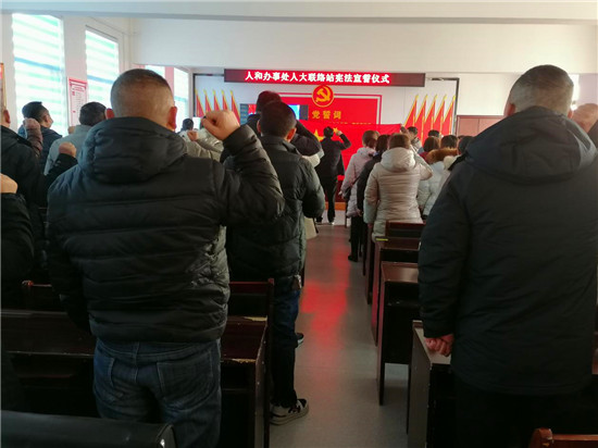 人和街道辦事處人大工委主任韓鈞右手舉拳,領誦誓詞,全體宣誓人肅立,面向國旗莊嚴宣誓。