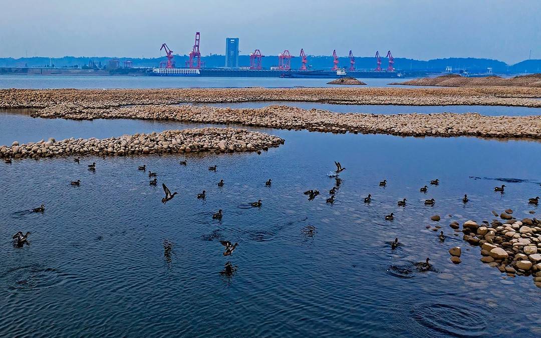 枯水期長(zhǎng)江宜都段灘涂成鳥(niǎo)類樂(lè)園。