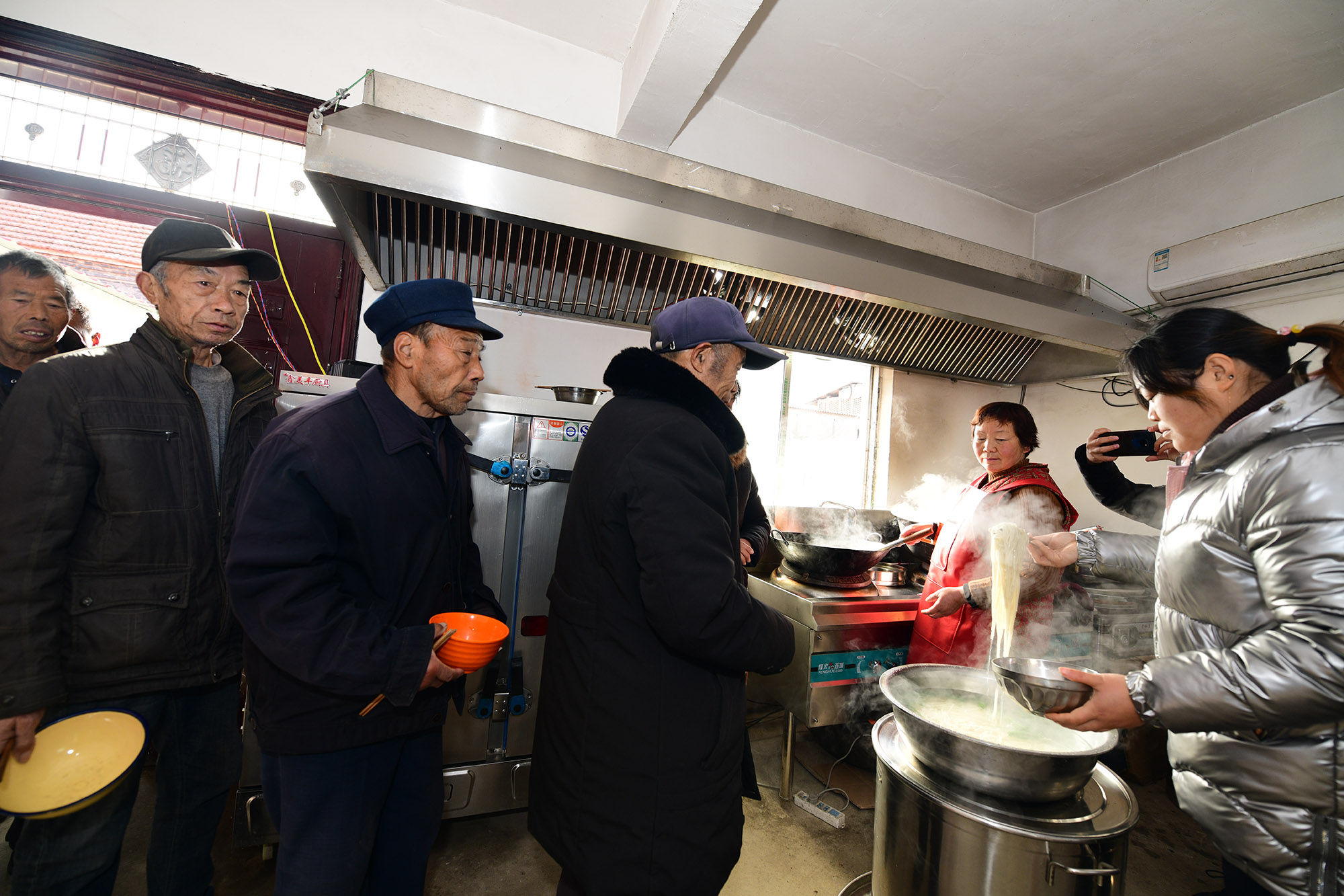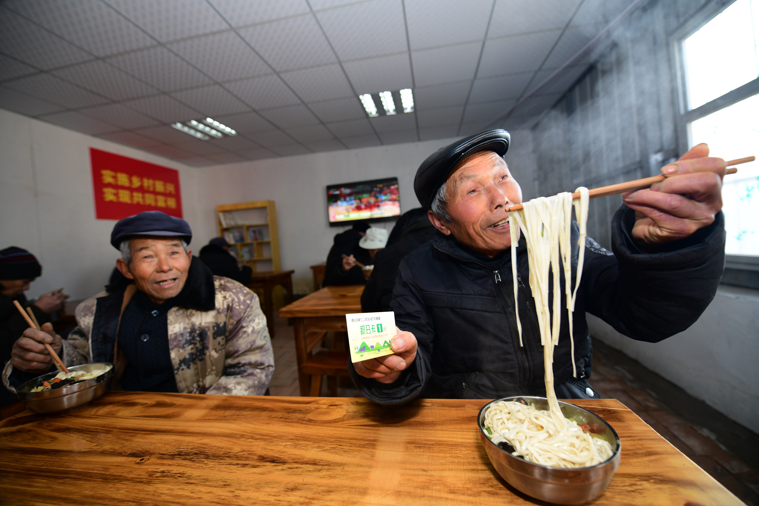 兩個(gè)月前,經(jīng)過(guò)籌備,七里倉(cāng)二村的村食堂建成,大鍋飯開(kāi)伙。食堂設(shè)在一家去世的五保戶家里。村里將房子內(nèi)外粉刷一遍,還買來(lái)了廚具、桌椅。做大鍋飯的是村里的兩名留守婦女。記者于12月15日中午趕來(lái)時(shí),村食堂正開(kāi)飯,老人們憑票打飯,午飯是臊子面。老人每人端一碗,來(lái)到飯廳就餐。這里有村里裝的電視,大家邊聊天邊吃飯邊看電視,其樂(lè)融融。