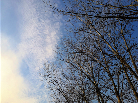 近日,我市天氣晴朗,漫步在街邊小道上,抬頭望去,處處皆是風(fēng)景,比如蔚藍(lán)的天空、挺立的高樓、蒼茫的禿枝……這一切都勾勒成了一幅唯美的冬日畫卷。