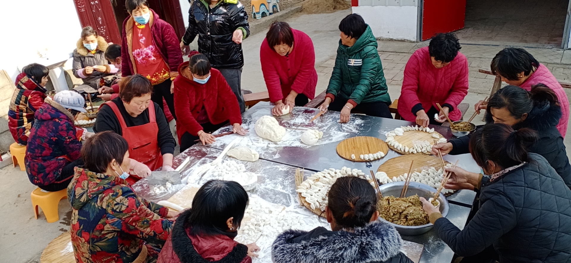 鄉(xiāng)村大食堂院子里,大家有說有笑,圍在數(shù)平方米的巨大案板前,個(gè)個(gè)拿出了看家本領(lǐng),分工協(xié)作,揉面、搟皮、包餃子,個(gè)個(gè)動(dòng)作嫻熟,包起餃子來麻利干練,不知不覺間,面前的盤子里就擺滿了餃子。